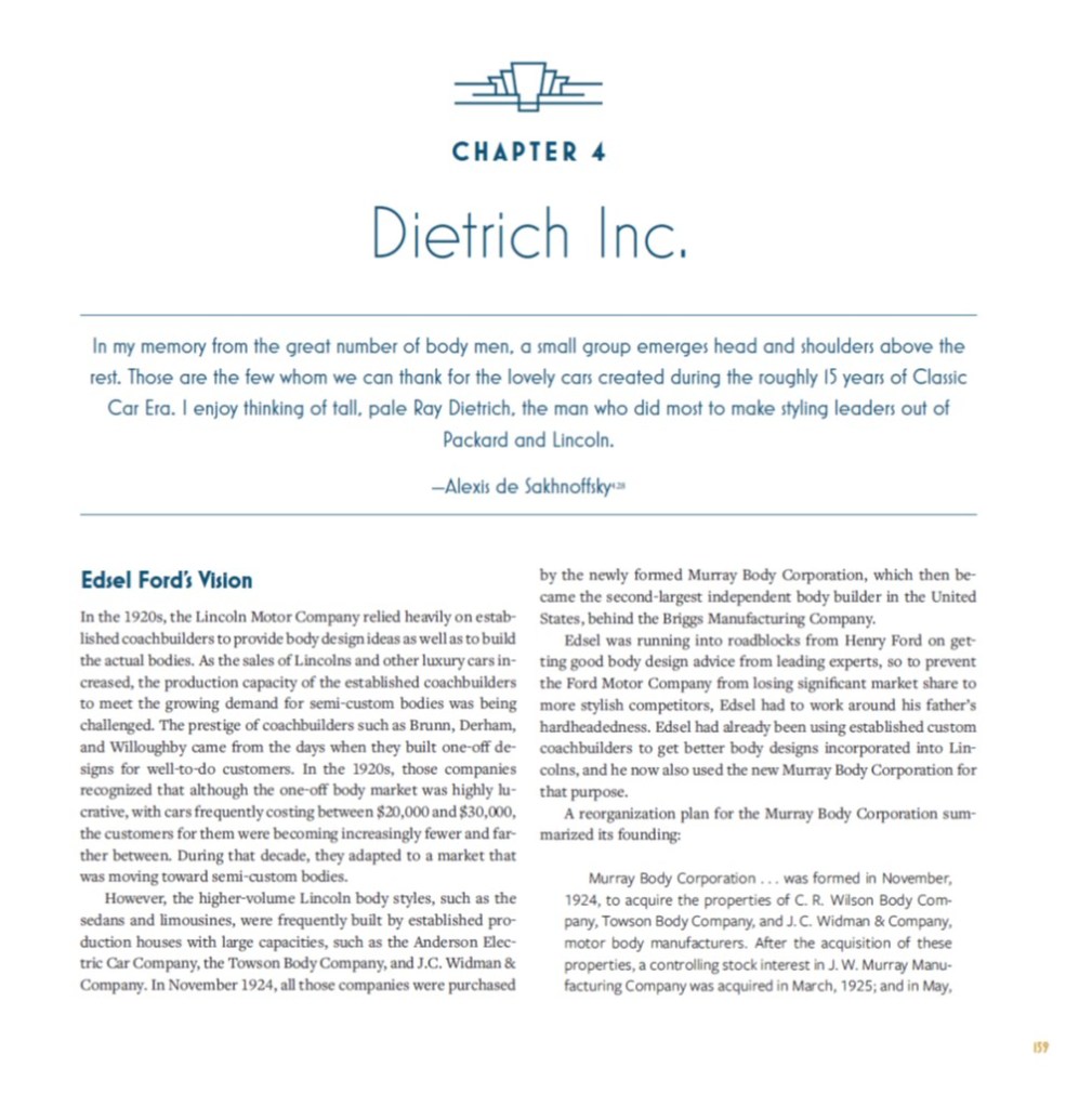 “This book is a must read for all students of the era of the zenith of automotive design. The author leads the reader through the evolution of the importance of design in producing and selling automobiles, especially the grand marques of the 1920s and 1930s, and the incredible influence of Ray Dietrich and Tom Hibbard on that process.